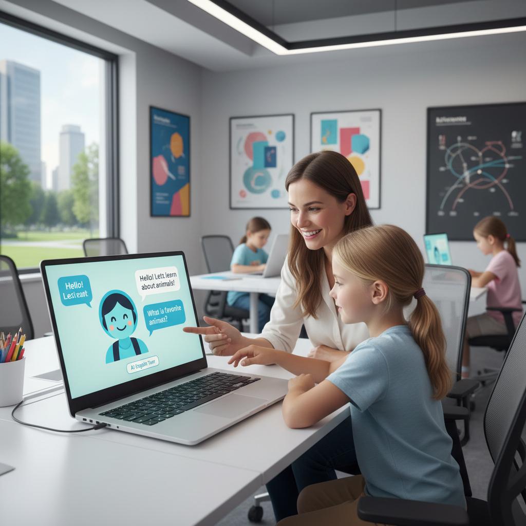 Nauczyciel i dziecko pracują razem z AI podczas lekcji angielskiego – przyszłość edukacji językowej w polskiej szkole.