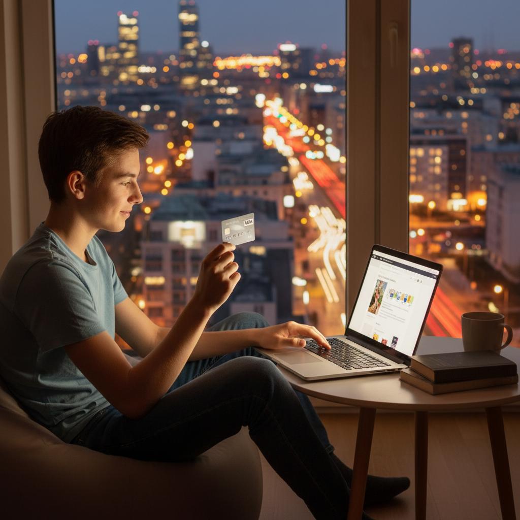Polski nastolatek korzystający z korepetycji online, karta kredytowa na biurku, wieczorne światła miasta. Słowa kluczowe: korepetycje online karta kredytowa