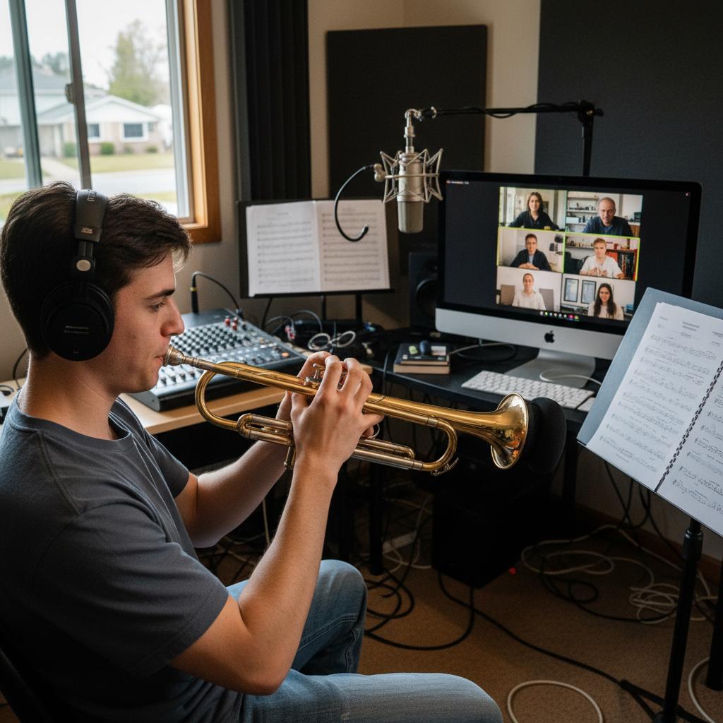 Nauka gry na trąbce realizowana zdalnie, przy wykorzystaniu łączności internetowej – zarówno z nauczycielami na żywo, jak i przez dedykowane platformy edukacyjne czy aplikacje oparte na AI. -