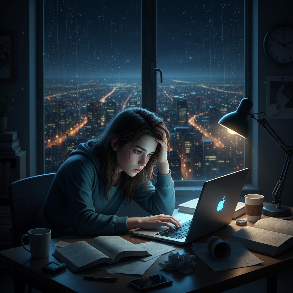 Studentka przygotowująca się do egzaminu na studiach — choroba wyklucza ją z zajęć na ponad tydzień. Ostatnia deska ratunku to nocny czat z korepetytorem online oraz błyskawiczna analiza problemowych zagadnień z matematyki.